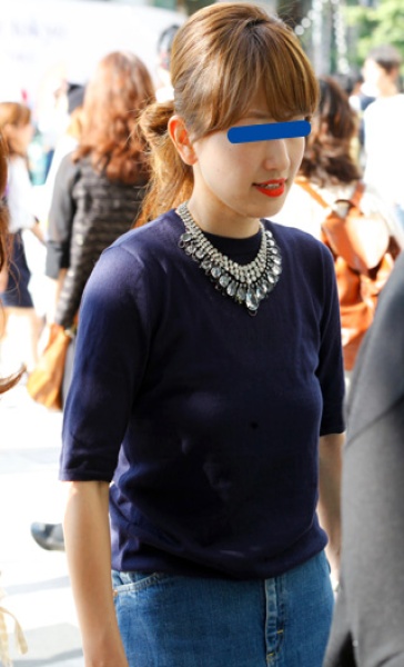 ニット+ジーンズの定番スタイルだが、存在のあるビジューネック...