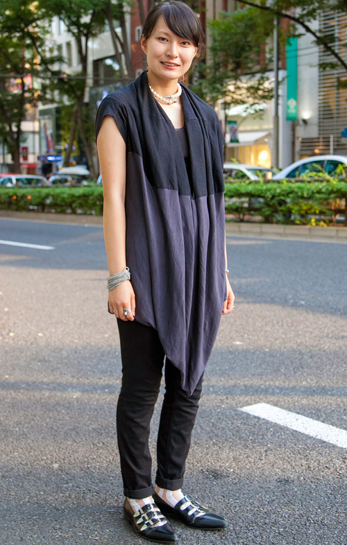 服装がシンプルな分、首もとや顔周りにボリュームを足すスタイル...