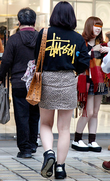 黒のスウェットをアニマル柄のミニスカートと合わせた80年代風...