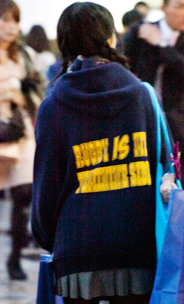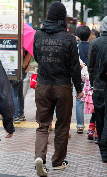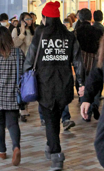パーカー、デニムにニット帽とラフな格好だが、バックプリントが...
