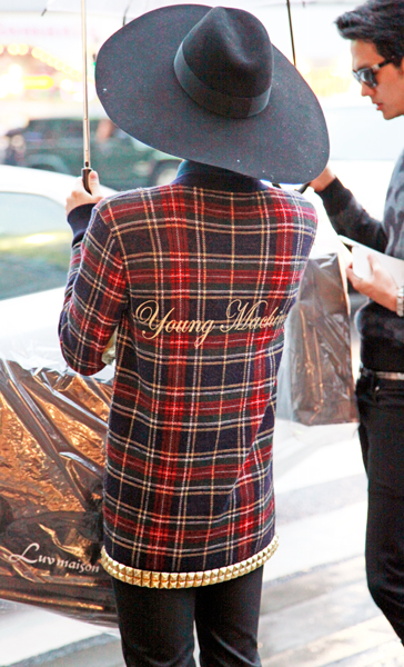 チェック柄にレタードを重ね、裾に金の鋲を施したロックテイスト...