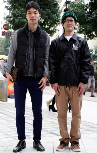 90年代に流行ったようなナイロンジャケットにGパン、帽子を反...