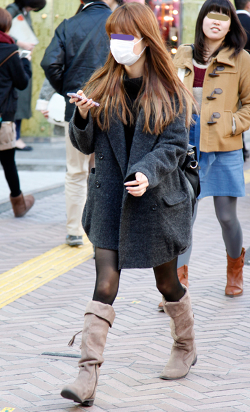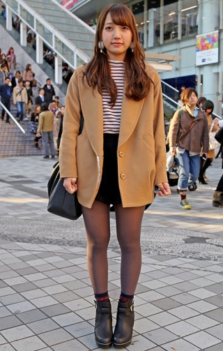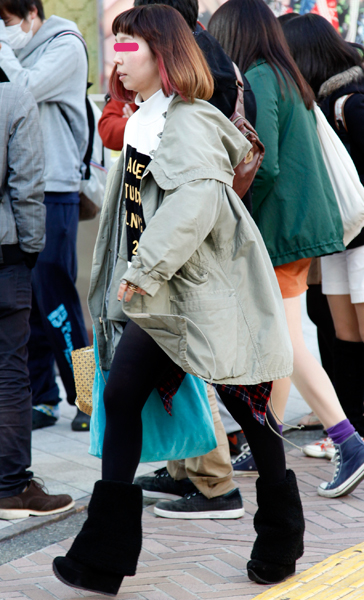 スヌードでタートル風のシルエットを形成したコーディネート。首...