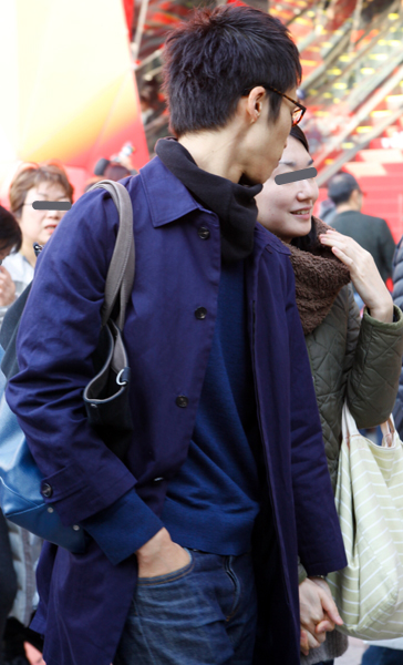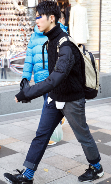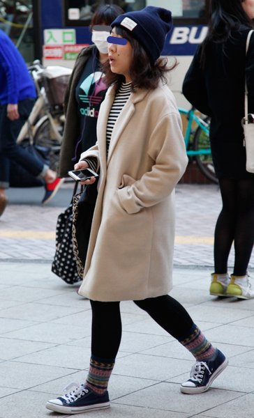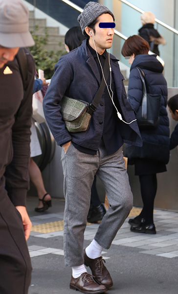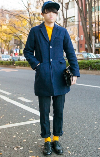 ニット帽とロングコートでまとめたスタイルはシティボーイの様。...
