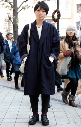 ビックシルエットのコートにスキニーパンツを合わせた逆三角形の...