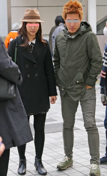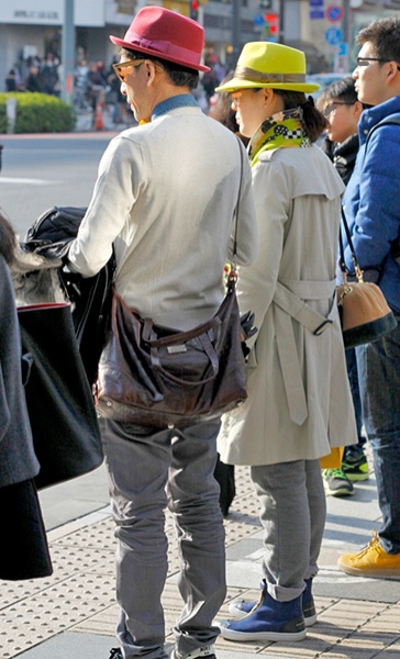 ペアルックのカラフルな中折れ帽で目立っていた40代カップル。...