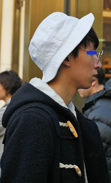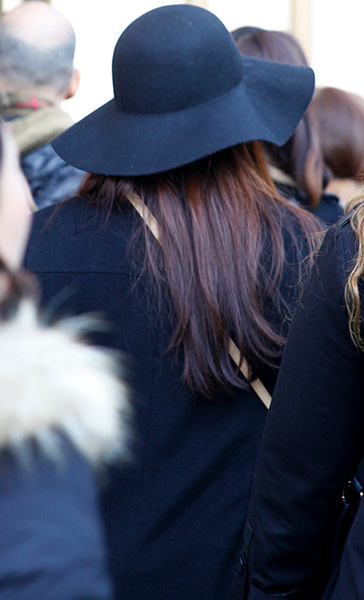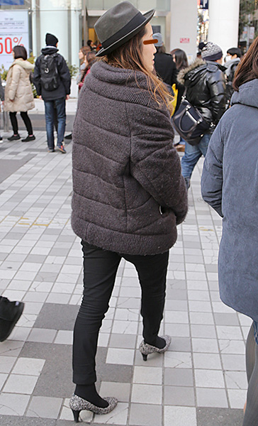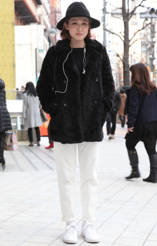 ボリュームのあるアウターに負けないよう、ハットで顔周りにポイ...