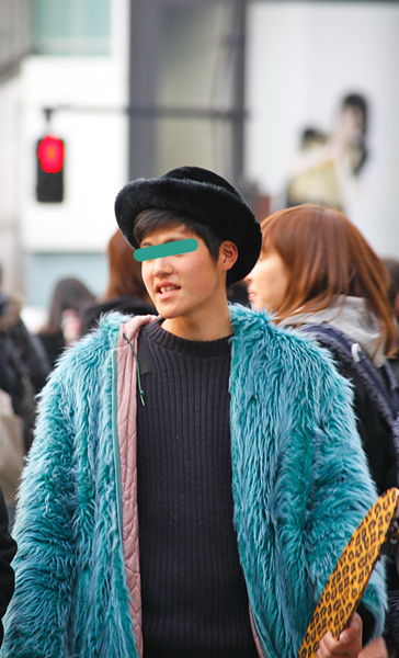 ハット+ファージャケット+ダメージジーンズでロック歌手のよう...