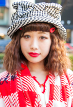 ハットを集めるのが好きです。フリフリのレースがついているものとか、変わった形のものを5つ持っています。その他にもカウボーイハットやベロアのハットも持っています。この帽子は大きなリボンがついているところと、レインコートのような他にはないデザイン、素材が気に入りました。帽子は、2〜3年前の髪の毛が明るかったときにはあまりかぶらなかったけれど、暗くしてからかぶるようになりました。髪の毛が暗いので洋服は赤いものが多く、全体的に明るく鮮やかな服装にして、それに合わせて帽子でバランスをとるようにしています。あとは身長が低いので、少しでも高く見せるためにというのもあります。