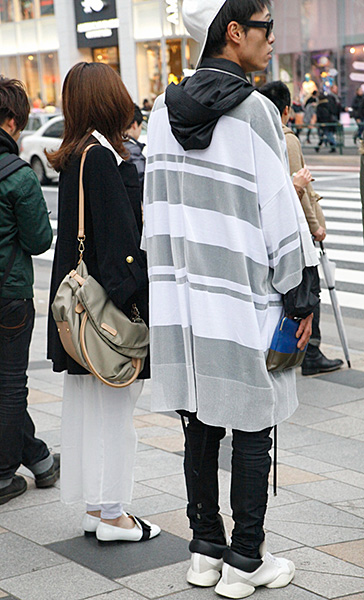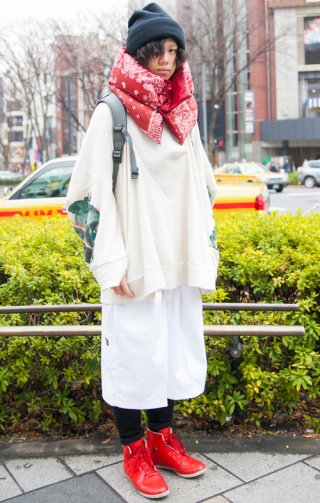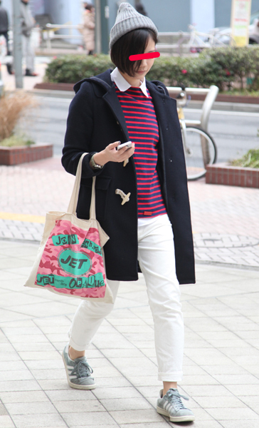 白いコットンパンツは、ボーダーにダッフル、ニット帽とB-SH...
