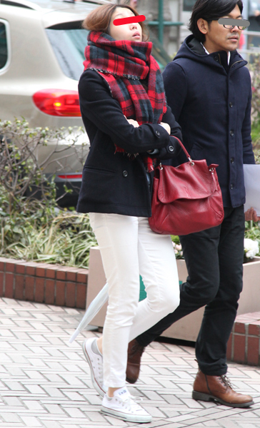 紺のPジャケットに赤いチェック柄の巻き物など、カジュアルなコ...