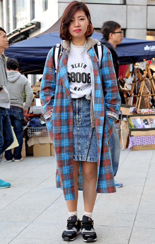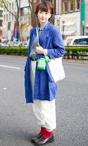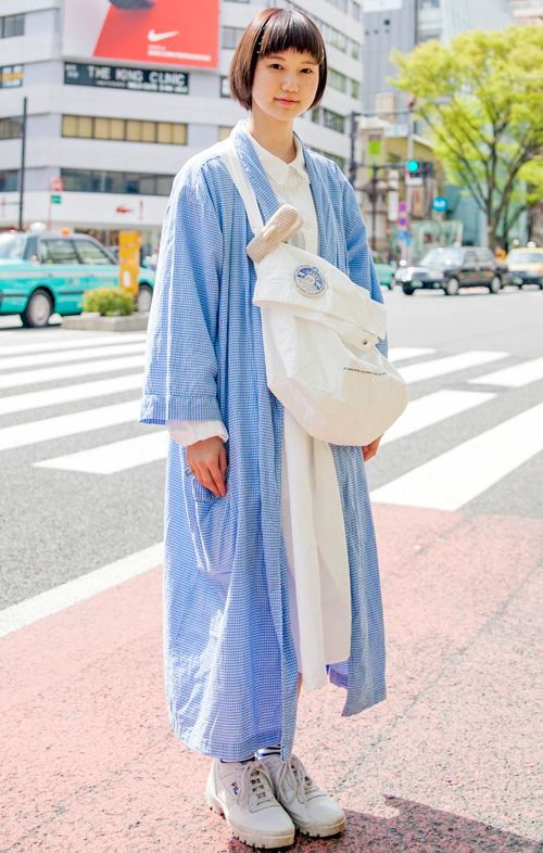 ・全体=春または秋に着る薄手のコート、またはロングシャツやローブのような羽織ることのできる形状のものをいちばん上にアウターのように着用している女性すべて。色や柄は問わない。