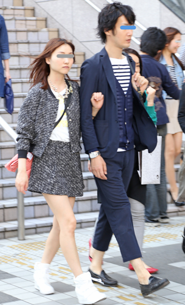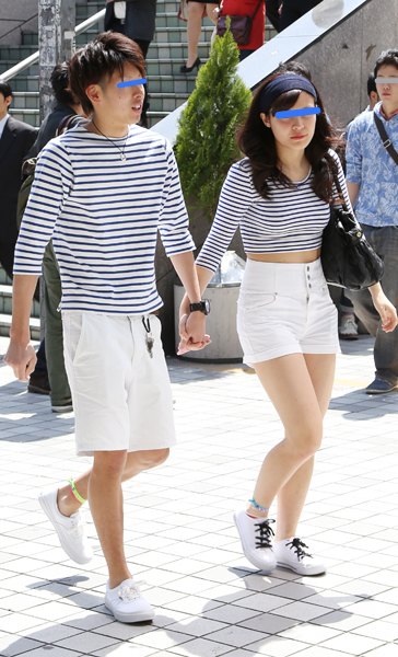 アイテムと色柄を揃えたペアルックのカップル。おそろ人気は継続...