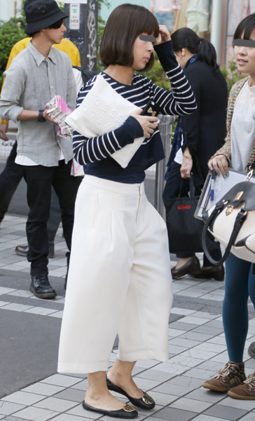 袴のような太パンツにトリーバーチのフラットシューズを合わせた...