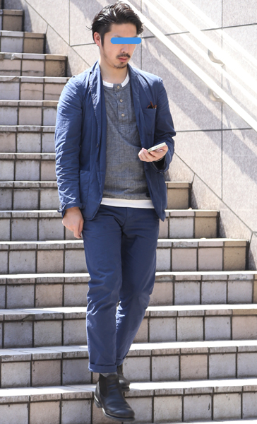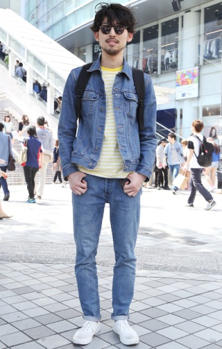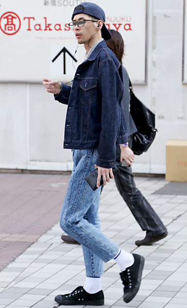 ケミカルウォッシュのパンツにリジットデニムのGジャンを合わせ...
