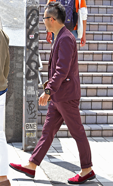 ともすればヤンキー風に見えなくもないえんじ色のセットアップ。...