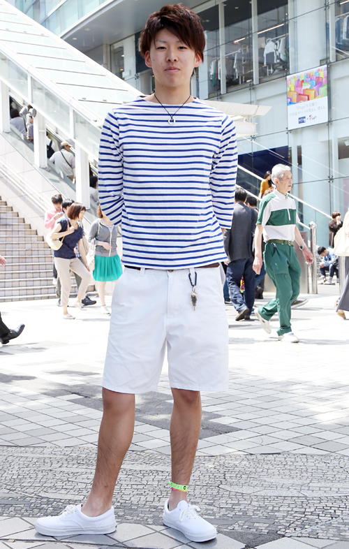 大学生に多いソフトなギャル男。白のハーフパンツ+シャンブレー...