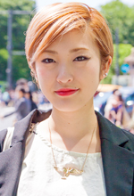 七三分けはずっとしています。一時期は伸ばしていたこともありましたが、基本的に髪の毛はショートです。働いているところで髪を切ってもらっています。前髪はいま、伸ばし中です。メイクは、赤リップをいつもしています。今日は時間がなくてしていませんが、最近青いマスカラにハマっていて、出勤のときとかにはほぼ毎日つけています。