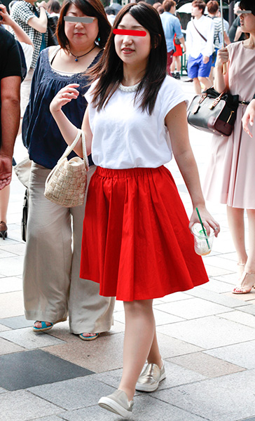 赤のミドル丈スカートがレトロな印象の彼女。コスプレ感覚を楽し...