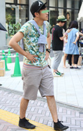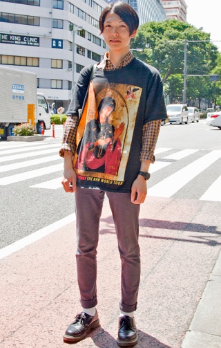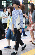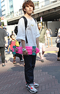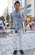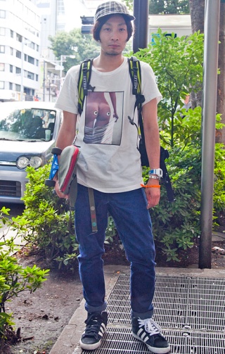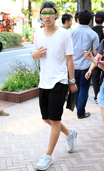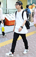 20代前半の男性に、白Tシャツ×黒パンツのモノトーンコーディ...