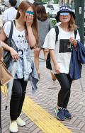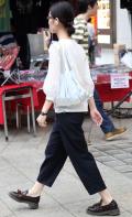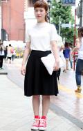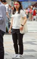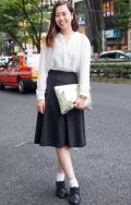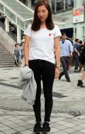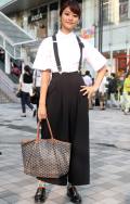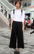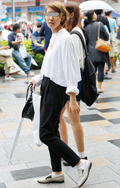 黒いボトムスを着用していて、合わせたトップスが白の女性すべて。ワンポイントのデザインがあしらわれているものは含むが、柄は含まない。プリント等は、全体の3分の2以下である場合は含む。素材は問わない。