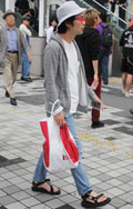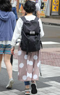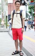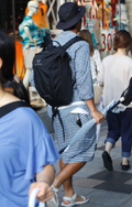 ナイロン素材のザックに、スポーツサンダルの組み合わせ。