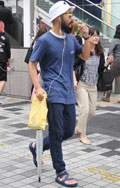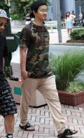 ジャージー素材のパンツにサンダルを合わせたスタイル。