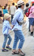 お揃いコーデの父子の足元はKEEN(キーン)のサンダル。つま...