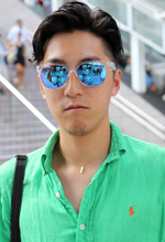 このサングラスは海に行くためにサングラスを店で探していたとき、かわいかったので買いました。流行を見てミラードのものを選びました。他にも最近サングラスを3つ買っていて、1つめはRay-Ban(レイバン)のラウンド、2つめは今日のものに形が似たべっこうフレームに茶色のレンズで、いちばん使っているもの。3つめはRay-Banの大きめのグラスのもの。フレームの上が黒で下がシルバーのデザインです。サングラスをするときには特に髪型を気を付けています。メガネのときはハットをかぶることが多いです。