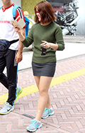 カーキのニットをミニスカートとスニーカーでヘルシーに着こなし...