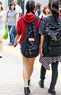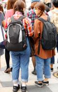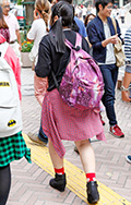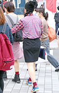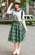 三つ編みヘアにチェックシャツ+高めの位置で背負ったリュックで...