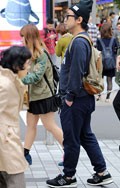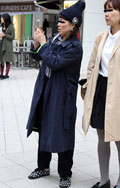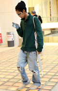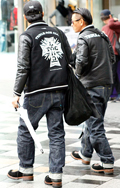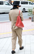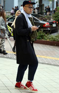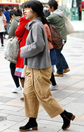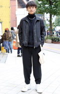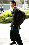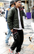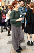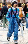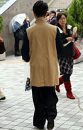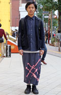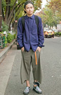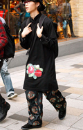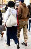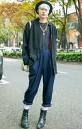 男性にはデザイン性が高い太パンツが多かった。こちらは片方だけ...