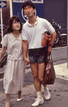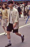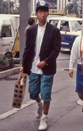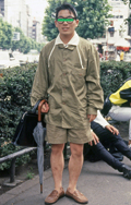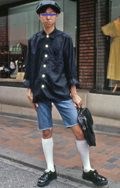 革製(合皮も含む)の靴と、綿麻素材の無地のトランクス型の膝丈パンツを合わせているもの。