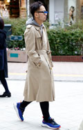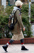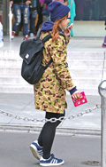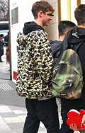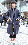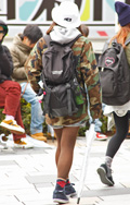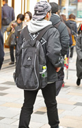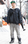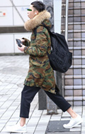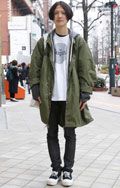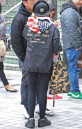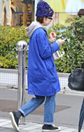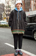 トップスやアウター類に頭を覆うフードが付いていて、それを背部の肩部分に露出したスタイルの男女すべて。色や素材、柄は問わない。
