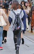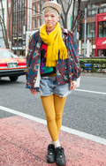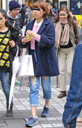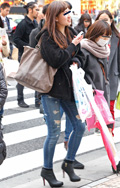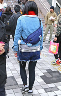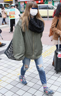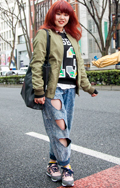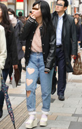 ギャル系の女性は、ダメージデニムをロールアップして着用。ハイ...