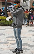 ケミカルウォッシュのスキニーデニム。スニーカーをはじめリュッ...