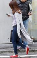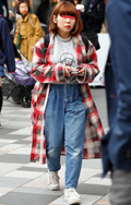 チェックのネルガウンに色落ちデニム、足元はスニーカーというグ...