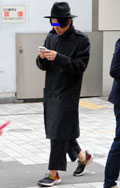 ポーラーハット+チェックのガウンコートでミュージシャン風の男...