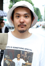 昔からダメージデニムが好き。Tシャツとスニーカーに合わせています。10年前に洋書で、無頓着すぎてボロボロのデニムが腰パンになってる浮浪者の写真を見て、ストリート系でわざと腰パンをしていた自分にはすごくかっこよく見えました。中にはスパッツを履いて、素肌は見せないようにしています。自分のファッションの変遷としては、アメカジを掘り下げていく中でストリートの元ネタがアメカジであることを知って、それからあとは、Martin Margielaなどのハイファッション系に。ハイファッションでも、アメカジがサンプリングされていることを知って、そっちにも興味を持ち始めました。