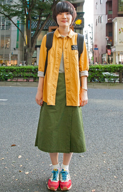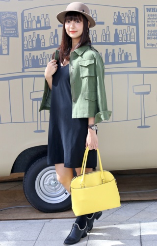 トップスまたはボトムスが「カーキ色」のものを着用している女性すべて。「カーキ色」の識別としては、「ベージュではない」、「グレーではない」、「緑ではない」色。迷彩などの柄がある場合もカーキ色が全体の3/4以上を占めていれば可。素材は問わない。