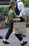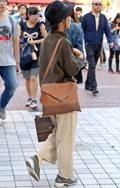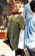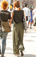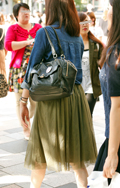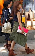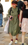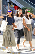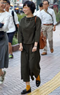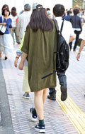 トップスまたはボトムスが「カーキ色」のものを着用している女性すべて。「カーキ色」の識別としては、「ベージュではない」、「グレーではない」、「緑ではない」色。迷彩などの柄がある場合もカーキ色が全体の3/4以上を占めていれば可。素材は問わない。