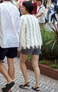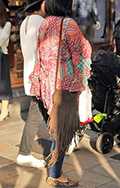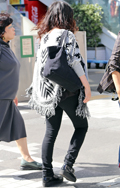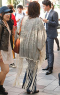 インパクト大な足下まで届きそうなフリンジカーディガンの女性。...