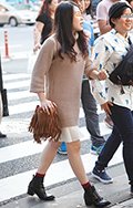 ベージュのタートルニット+フリンジバッグでボヘミアンテイスト...