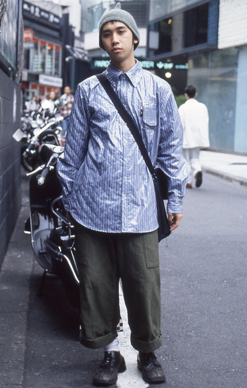 いわゆるシャツをいちばん上に着用するスタイルで、上にベストやジャケットなどを着用している場合は除く。裾は、出していても中に入れていても構わない。シルエットや裾の長さ、素材も問わない。