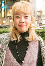 今日の格好で髪を下ろしたままだと野暮ったく見えてしまうと思って、上げています。ハーフアップは小顔効果もあるし、髪を上げるとピアスが目立つのがいいなと思って、学校の先輩の髪型をまねしてみました。昔はポップな色合いのものを服を着ていたけれど、最近は古着がメインです。足を隠す必要も出てきたし…。