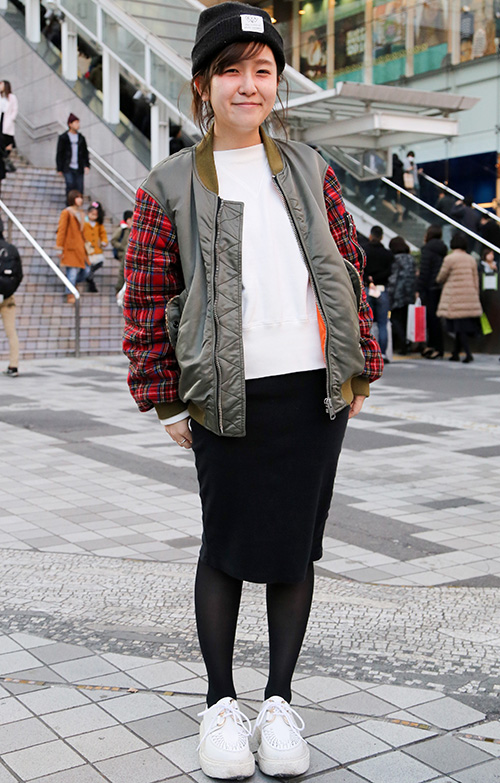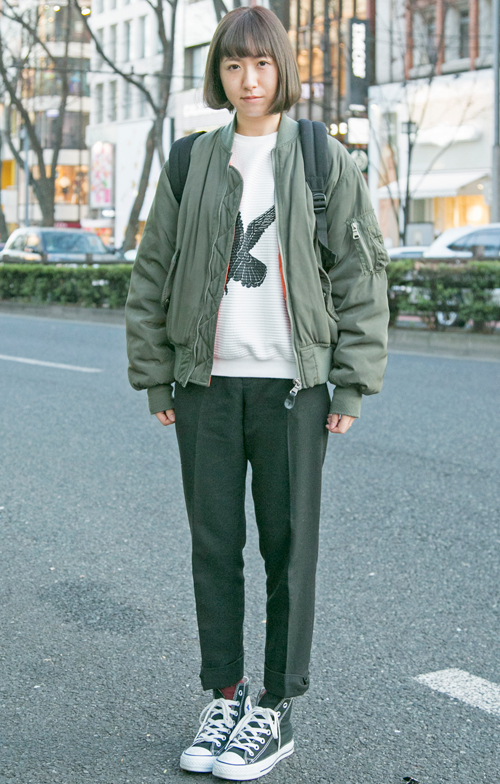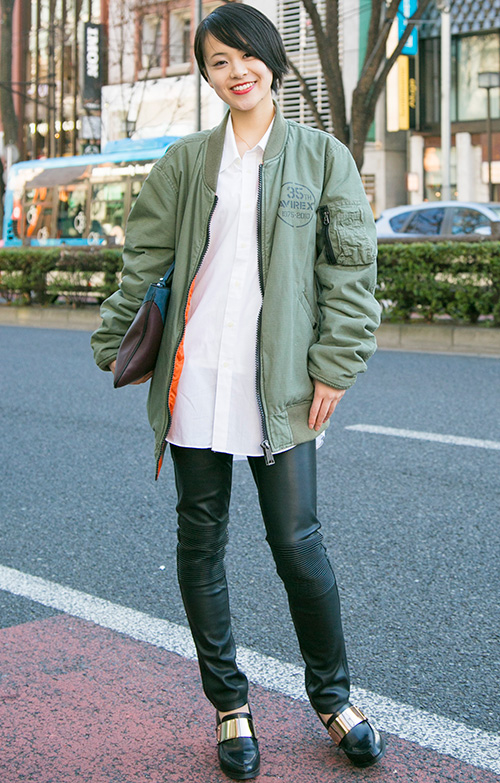 MA-1のような襟や袖のデザインが施されたアイテムを着用する女性すべて。素材や丈は問わない。