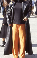この黒いロングコートはとにかく気に入っていて。今日もコートはこれを着ていこうと決めていました。それに合わせてパンツを考えたとき、母からもらったこのパンツを合わせたらかわいいなと思ったので、このオレンジのパンツは今日初めて着ました。