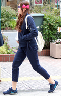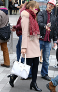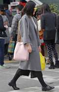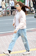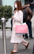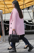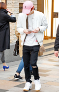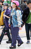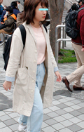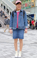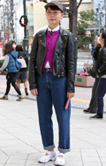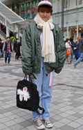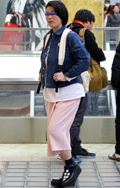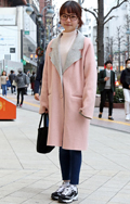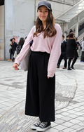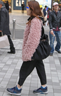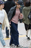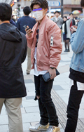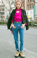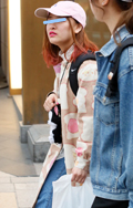 ヘアとコーチジャケットのピンクが目を引いた彼女。脱ノームコア...
