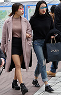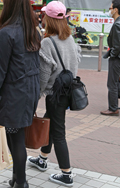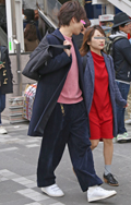 韓国人旅行客?と思われるトレンド感たっぷりの2人組。ピンク、...