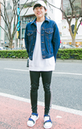 アディダスのジャージにルーズなデニムやキャップを合わせた、ボ...